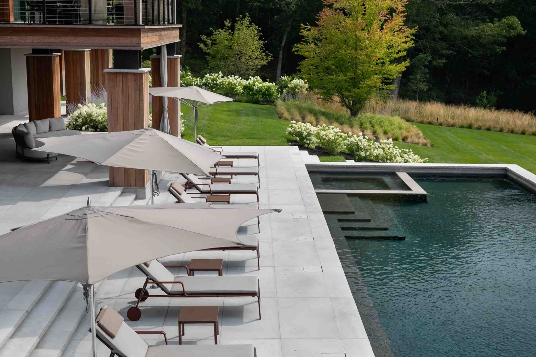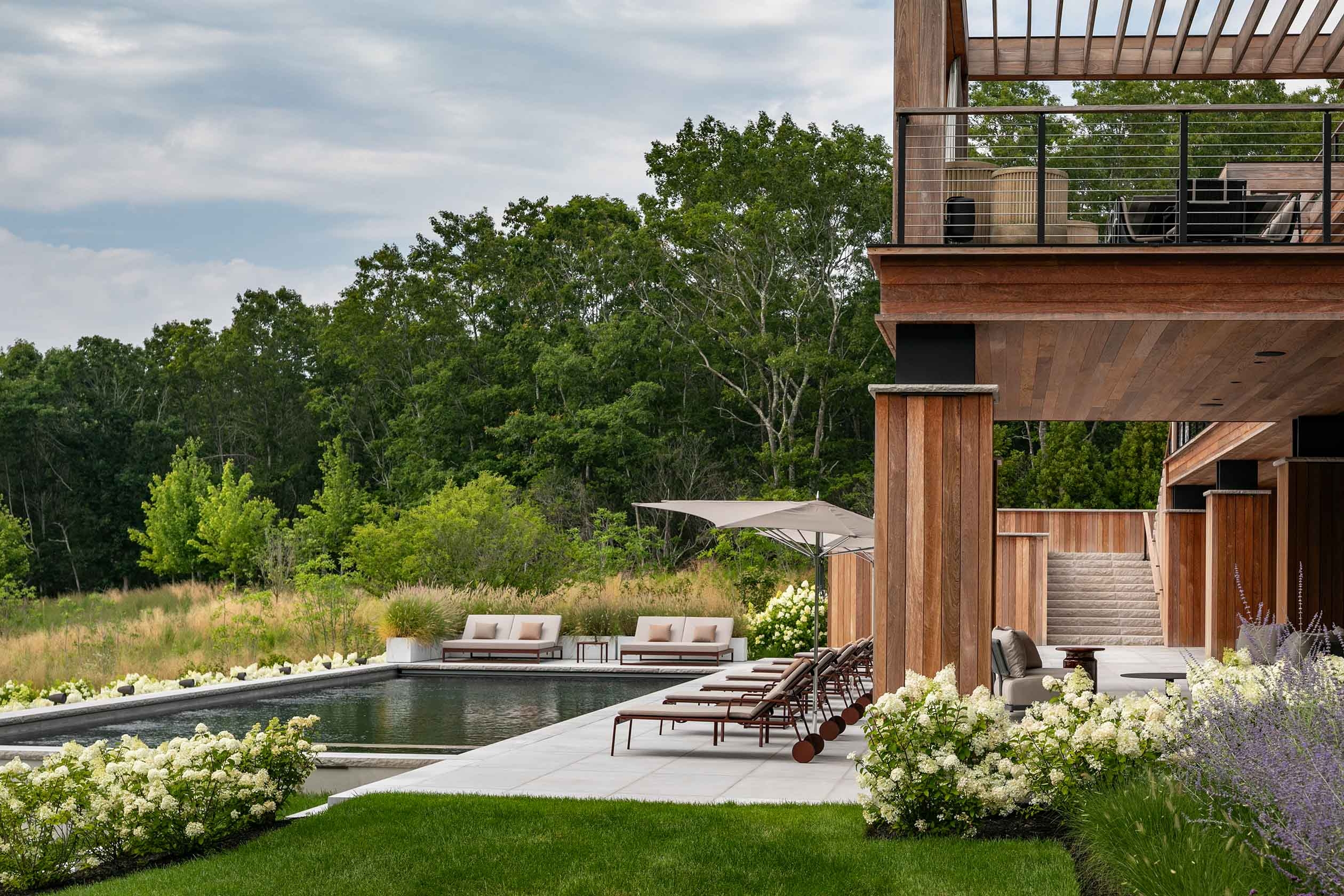 Set within the wooded coastal hills of Water Mill, this residence was conceived as a grounded and enduring presence in the landscape. The three-storey home stretches horizontally across a sloping site, carefully carved into the hillside to maintain privacy while embracing expansive views over Peconic Bay.